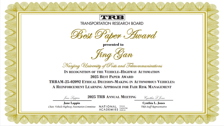 我院教師論文獲交通領(lǐng)域國(guó)際頂會(huì)TRB ACP30 Committee最佳論文獎(jiǎng)